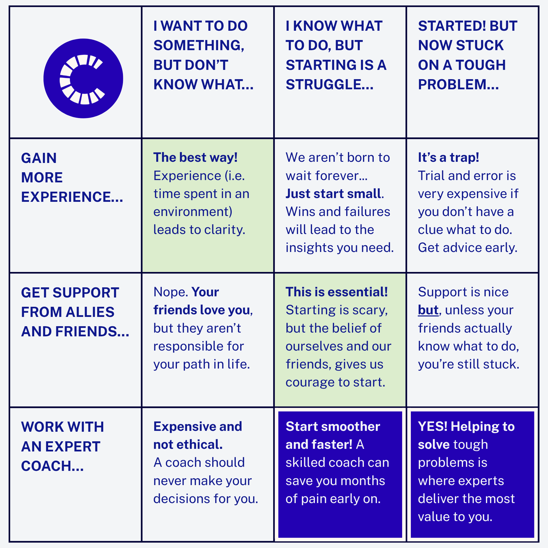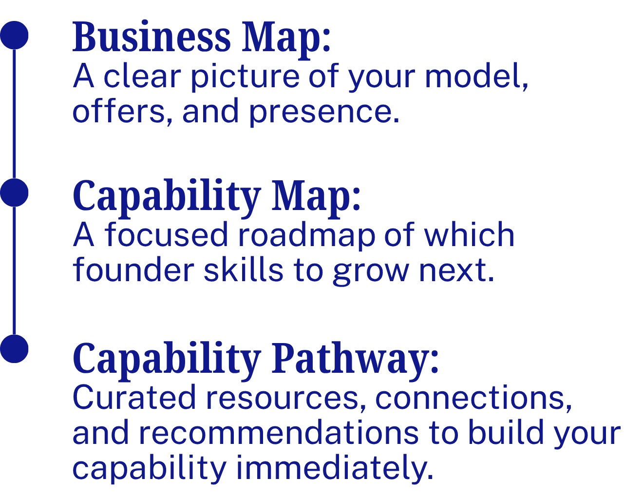 We offer a pathway of services that accelerate progress for early stage founders by boosting your clarity, capability, strategies, and traction.